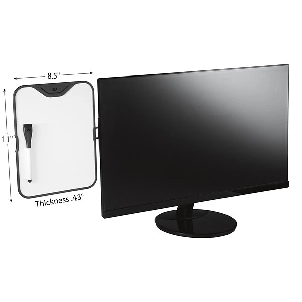 - A dry erase panel that attaches securely to your computer monitor with a Command™ Adhesive Strip keeping your notes and task organized, front and center so you get more done.
