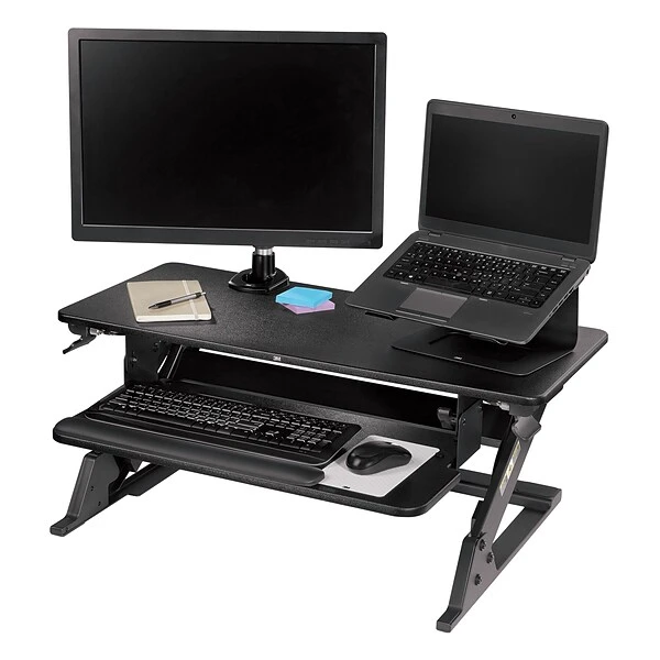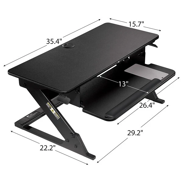 - Primary work surface is 35.4″ W x 23.2″ D and is large enough to fit two 24” monitors and holds up to 35 lbs