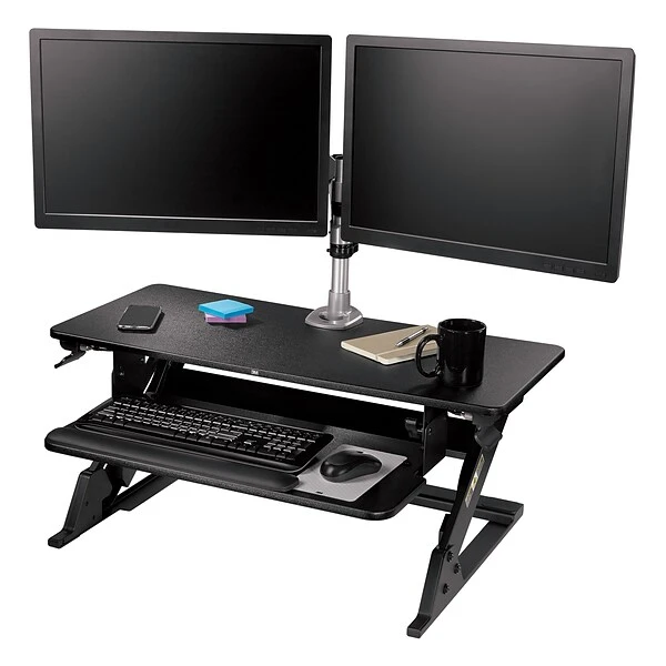 - Gas assist continuous height adjustment allows you to move smoothly and quietly between sitting and standing positions in seconds