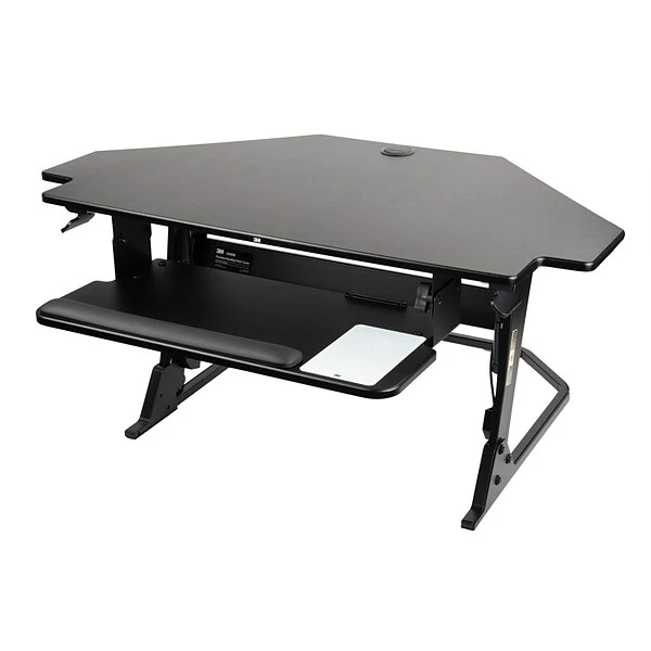 The 3M™ Precision Standing Desk Corner is designed for a 90 degree corner desk to maximize “wasted space” in the corner. Side-mounted levers controlling gas assist height change technology allows for continuous height settings from 6.2″ to 20″ above the desk surface. The keyboard surface has a tilt adjustment range of +10/-10 degrees to help achieve the most comfortable typing position. The 3M™ Precision Standing Desk also includes a 3M™ Gel Wrist Rest and Precise™ Mouse Pad for added comfort and productivity.