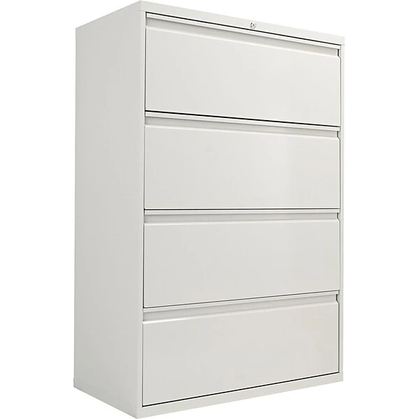 Alera® Four-drawer lateral file cabinet in light gray color features durable powder coated finish that helps to prevent scratches. Cabinet measuring 53 1/4″ x 36″ x 19 1/4″ comes with 4 adjustable leveling glides and single key core removable lock.