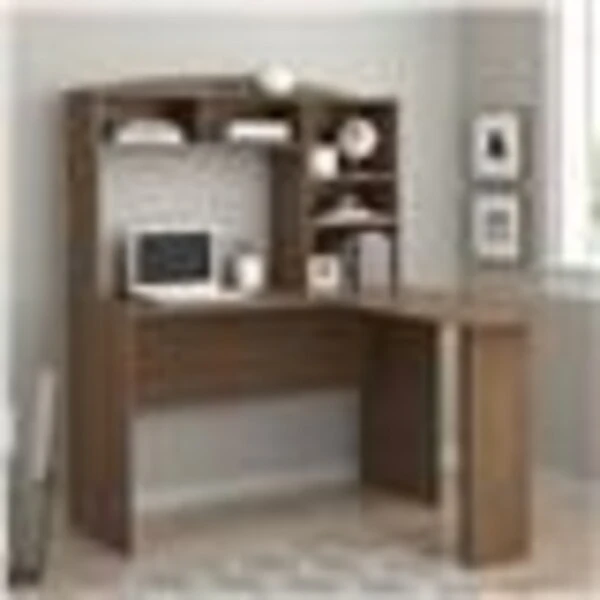 Create an organized home office with the Altra Sutton L Desk with Hutch. This Desk features a classic L shape to give you plenty of room for your laptop, with additional room to spread out projects or paperwork. The Hutch gives you even more room to store notebooks, documents, binders or photos with its 5 open cubbies. This Desk is designed to give you plenty of leg room but also doesn’t take up too much space in your home. The medium brown Saint Walnut finish works well with most décor. Altra Sutton L Desk with Hutch requires assembly upon delivery.