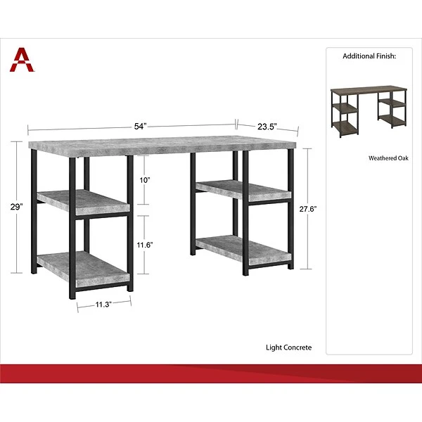 Your home office can now be functional and phenomenal thanks to the multi-functional Ameriwood Home Ashlar Desk. Crafted in the double-pedestal style, this desk boasts a faux-concrete look made from specially laminated paper, making it easy to clean and simple to maneuver. The 4 open shelves are built to hold all your home-office needs, from a printer and scanner to paper, pens, agendas, and more. Just add accessories and make yourself at home. Sturdy black metal legs are made to support and distribute the load, so the Desk is all you need to get your work done. The Desk ships flat to your door and requires assembly upon opening. Two adults are recommended to assemble. Once assembled, the Desk measures to be 29″H x 54″W x 23.5″D.