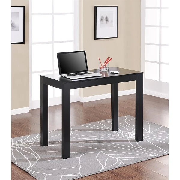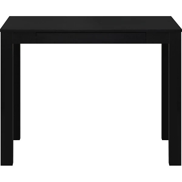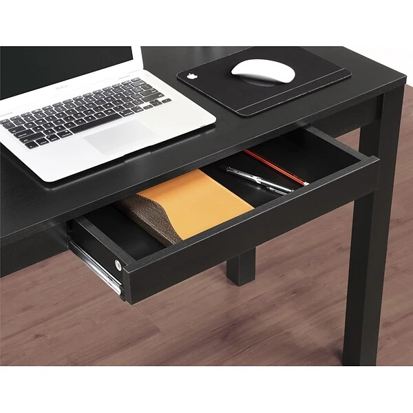 Redefine your workspace or any room in your home with the sleek, minimalist lines of this attractive Ameriwood Home Parsons Desk with Drawer. This Desk is designed with classic parsons styling that includes a simple silhouette with clean lines. The preassembled desktop means this Desk goes together simply by attaching the 4 legs so you are ready to work in no time. The Desk features a small center storage drawer that’s perfect for pens, paper, computer peripherals and other small office supplies. The Desk also works great as a side table in your living room. Made of laminated MDF and particleboard, the beautiful black finish looks right at home with dark bold colors or it can be paired with neutrals for a subtle look. The Desk ships flat to your door and minimal assembly is required. Once assembled, the Desk measures to be 30″H x 39″W x 19.7″D.
