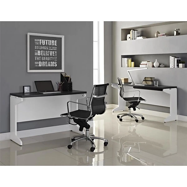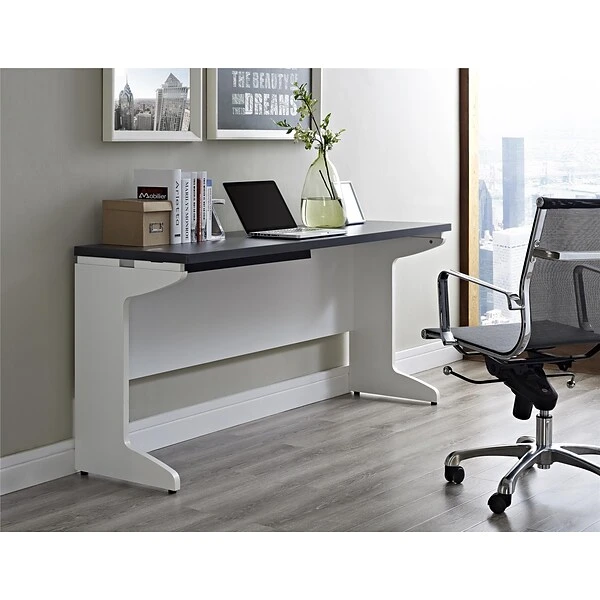 Add a workspace anywhere with the commercial grade Ameriwood Home Pursuit Credenza. Whether you need a desk in your home office or an extra workstation in your conference room, the credenza’s minimalist design will fit effortlessly. It has a wide desktop, creating a larger work surface, slim shaped side panels for easy leg movement and a wire management trough and slots to keep cords organized. The subtle curves and beautiful white and gray finish also give the credenza a refined elegance that’ll enhance the style of any room. When assembled, the credenza has dimensions of 29.5”h x 66”w x 19.5”d. It’s made of water-resistant PVC with a laminated hollow core for a durable build to last for years.