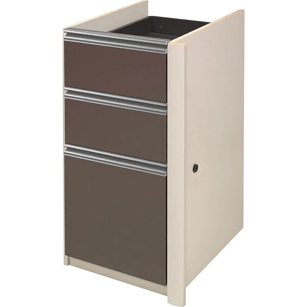 Organize your office in style with this Bestar pedestal file cabinet. With two spacious catch-all drawers and one drawer to accommodate letter- and legal-size files, this pedestal file cabinet keeps your workspace clean and tidy. This cabinet is reversible for greater flexibility and convenience. One lock secures the two bottom drawers for safe storage. Shock-resistant edge banding offers safety and impact resistance for greater durability.