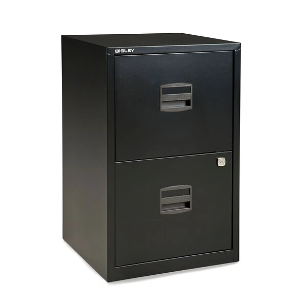 - Bisley® two-drawer steel home filing cabinet accommodates letter- and A4-sized files
