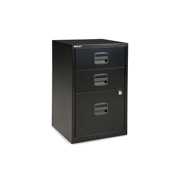 Sort office supplies and paperwork in this file cabinet. The vertical design saves valuable floor space in your office or cubicle, and the powder-coated steel construction stands up to heavy use. Two small box drawers make it easy to organize pens, notepads and other office essentials. Featuring a locking file drawer, this Bisley vertical file cabinet helps keep sensitive documents secure.