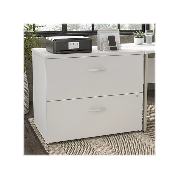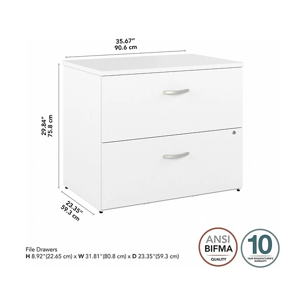 The Bush Business Furniture Hybrid two-drawer lateral file cabinet offers a stylish, long-lasting storage solution for the modern professional. Keep all your letter-, legal-, and A4-size documents organized inside two drawers that open on full-extension ball-bearing slides for an effortless reach to contents. A single lock secures both drawers to protect files with sensitive information and safeguard any personal items you don’t want left out in the open. Each drawer can hold up to 75 lbs. of materials. The lateral filing cabinet’s stable design and included wall attachment hardware make it a safe choice for use in virtually any home or professional office environment. Find the perfect look for your space with five contemporary finish options: black walnut, modern hickory, platinum gray, storm gray, and white. This two-drawer file cabinet has been meticulously tested to meet or exceed ANSI/BIFMA quality standards for safety, durability, and performance and is backed by the Bush Business Furniture 10-year manufacturer’s warranty. See the full Bush Business Furniture Hybrid collection for coordinating items to enhance your workspace as needed, including computer desks, bookcases, and storage cabinets (coordinating items sold separately). American made with US and imported parts.