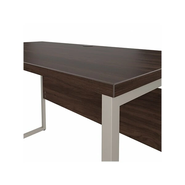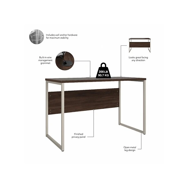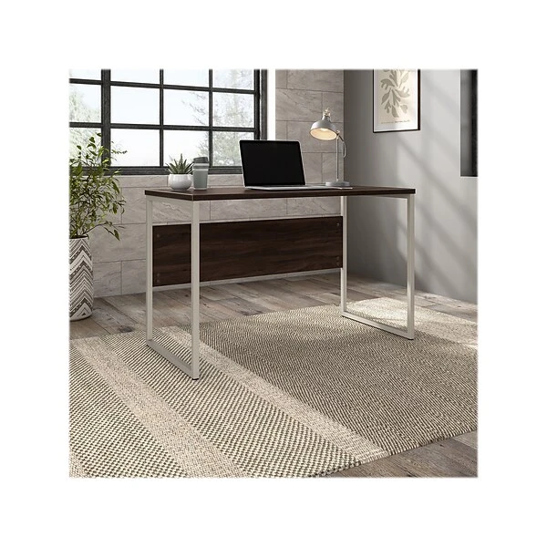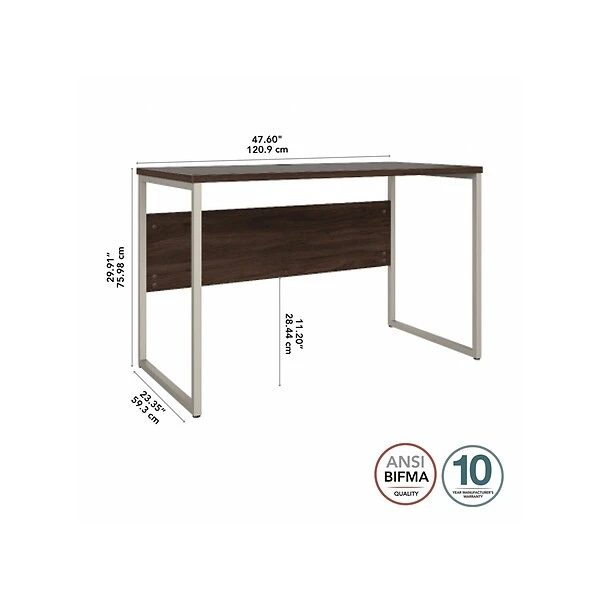 The Bush Business Furniture Hybrid 48″W x 24″D computer table desk blends a durable work surface with sturdy metal legs to offer a stylish, long-lasting solution for the modern professional. Tackle your next project or assignment with a computer, books, paperwork, and more on a desktop that supports up to 200 lbs. A built-in wire management grommet keeps cords and cables in order, so your work area remains free from unnecessary clutter. The computer desk’s open leg design and finished privacy panel allow it to look great facing any direction in a home or professional office environment. Find the perfect look for your space with five contemporary finish options: black walnut, modern hickory, platinum gray, storm gray, and white. This modern desk has been meticulously tested to meet or exceed ANSI/BIFMA quality standards for safety, durability, and performance and is backed by the Bush Business Furniture 10-year manufacturer warranty. See the full Hybrid collection for coordinating items to enhance your workspace as needed, including file cabinets, bookcases, and storage cabinets (coordinating items sold separately). American-made with US and imported parts.