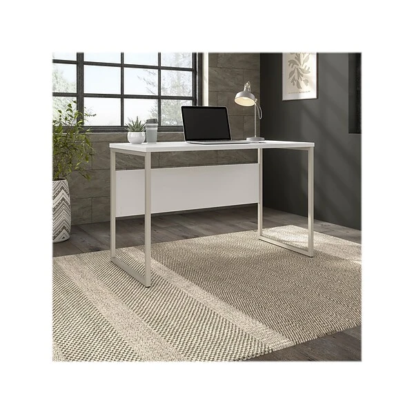 The Bush Business Furniture Hybrid 48″W x 24″D computer table desk blends a durable work surface with sturdy metal legs to offer a stylish, long-lasting solution for the modern professional. Tackle your next project or assignment with a computer, books, paperwork, and more on a desktop that supports up to 200 lbs. A built-in wire management grommet keeps cords and cables in order, so your work area remains free from unnecessary clutter. The computer desk’s open leg design and finished privacy panel allow it to look great facing any direction in a home or professional office environment. Find the perfect look for your space with five contemporary finish options: black walnut, modern hickory, platinum gray, storm gray, and white. This modern desk has been meticulously tested to meet or exceed ANSI/BIFMA quality standards for safety, durability, and performance and is backed by the Bush Business Furniture 10-year manufacturer warranty. See the full Hybrid collection for coordinating items to enhance your workspace as needed, including file cabinets, bookcases, and storage cabinets (coordinating items sold separately). American-made with US and imported parts.