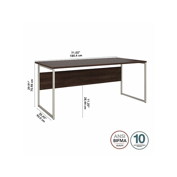 The Bush Business Furniture Hybrid 72″W x 36″D computer table desk blends a durable work surface with sturdy metal legs to offer a stylish, long-lasting solution for the modern professional. Tackle your next project or assignment with a computer, books, and more on a desktop that supports up to 200 lbs. Three built-in wire management grommets keep cords and cables in order, so your work area remains free from unnecessary clutter. The computer desk’s open leg design and finished privacy panel allow it to look great facing any direction in a home or professional office. Find the perfect look for your space with five finish options: black walnut, modern hickory, platinum gray, storm gray, and white. This modern desk has been meticulously tested to meet or exceed ANSI/BIFMA quality standards for safety, durability, and performance and is backed by the Bush Business Furniture 10-year manufacturer warranty. See the full Hybrid collection for coordinating items to enhance your workspace as needed, including bookcases, lateral file cabinets, and storage cabinets (coordinating items sold separately). American-made with US and imported parts.
