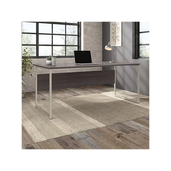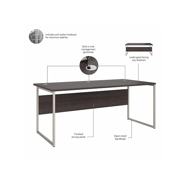 The Bush Business Furniture Hybrid 72″W x 36″D computer table desk blends a durable work surface with sturdy metal legs to offer a stylish, long-lasting solution for the modern professional. Tackle your next project or assignment with a computer, books, paperwork, and more on a desktop that supports up to 200 lbs. Three built-in wire management grommets keep cords and cables in order, so your work area remains free from unnecessary clutter. The computer desk’s open leg design and finished privacy panel allow it to look great facing any direction in a home or professional office environment. Find the perfect look for your space with five contemporary finish options: black walnut, modern hickory, platinum gray, storm gray, and white. This modern desk has been meticulously tested to meet or exceed ANSI/BIFMA quality standards for safety, durability, and performance and is backed by the Bush Business Furniture 10-year manufacturer warranty. See the full Hybrid collection for coordinating items to enhance your workspace as needed, including file cabinets, bookcases, and storage cabinets (coordinating items sold separately). American-made with US and imported parts.