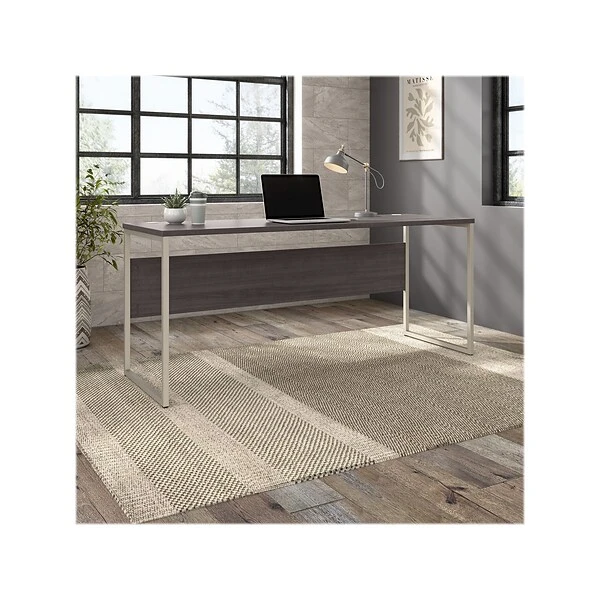 The Bush Business Furniture Hybrid 72″W x 24″D computer table desk blends a durable work surface with sturdy metal legs to offer a stylish, long-lasting solution for the modern professional. Tackle your next project or assignment with a computer, books, paperwork, and more on a desktop that supports up to 200 lbs. Three built-in wire management grommets keep cords and cables in order, so your work area remains free from unnecessary clutter. The computer desk’s open leg design and finished privacy panel allow it to look great facing any direction in a home or professional office environment. Find the perfect look for your space with five contemporary finish options: black walnut, modern hickory, platinum gray, storm gray, and white. This modern desk has been meticulously tested to meet or exceed ANSI/BIFMA quality standards for safety, durability, and performance and is backed by the Bush Business Furniture 10-year manufacturer warranty. See the full Hybrid collection for coordinating items to enhance your workspace as needed, including file cabinets, bookcases, and storage cabinets (coordinating items sold separately). American-made with US and imported parts.