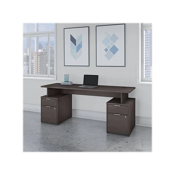 From large corporations to a single workspace, the Bush Business Furniture Jamestown 71″W computer desk with four drawers meets the needs of any professional office. With its contemporary style and adaptable modular design, this desk is built to meet the ever-changing demands of today’s professional workplace. Supported by a pair of two-drawer file cabinets, the elevated 71″W x 24″D desktop provides plenty of room to spread out with materials while a 200 lb. weight capacity accommodates multiple monitors and other equipment. Each file cabinet features one file drawer that opens on full-extension ball bearing slides for an effortless reach to legal-, letter-, and A4-size paperwork. Two box drawers keep office supplies organized and accessible, and all four drawers can be locked to secure sensitive documents and valuable items. This desk with storage is tested, meets or exceeds ANSI/BIFMA standards for safety and performance and is backed by a 10-year manufacturer limited warranty. American-made with US and imported parts.
