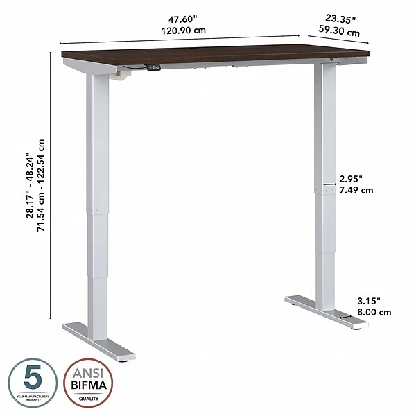 The Bush Business Furniture Move 40 electric height-adjustable standing desk is a perfect way to build an ergonomic workspace without the high-end price tag. Give your body and mind a break from sedentary work, and enjoy a healthier, more productive office with the push of a button. Three-stage units lift the desktop anywhere from 28″ to 48″ at a speed of 1.25″ per second, so you can change positions without missing a beat. The adjustable desk also features an anti-collision sensor that stops movement up or down if an object is detected. Available in several finishes, the durable thermally fused laminate work surface resists scratches and stains, while a welded 16-gauge steel base allows the desktop to support up to 176 lbs. This sit-stand desk is tested to meet ANSI/BIFMA quality standards for safety and performance and is backed by a 5-year manufacturer warranty.