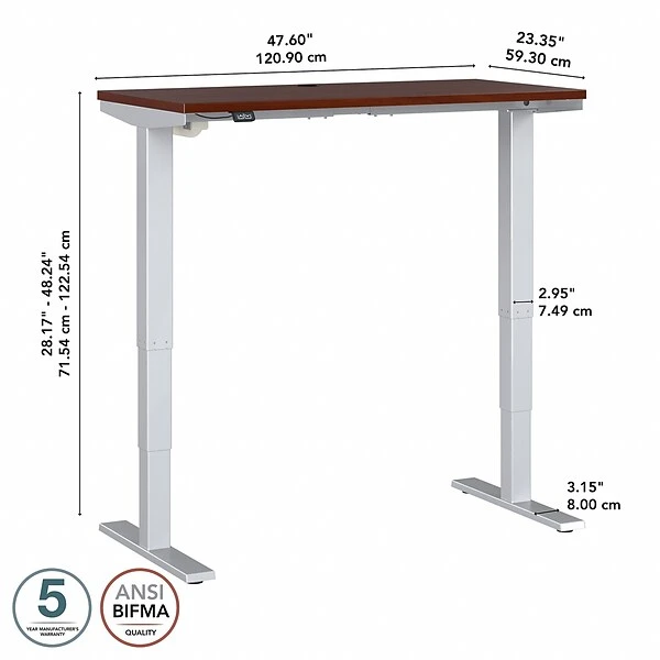 This Bush Business Furniture Move 40 height-adjustable standing desk is a great way to build a healthy and productive ergonomic office without a high-end price tag. Give your body and mind a break from sedentary work and enjoy a healthier, more productive office with the push of a button. Three-stage units lift the 48″W x 23″D desktop anywhere from 28″ to 48″ from the floor at a speed of 1.25″ per second so you can change positions without missing a beat. The adjustable desk also features an anti-collision sensor that stops movement up or down if an object is detected. The durable thermally fused laminate work surface resists scratches and stains while a welded 16-gauge steel base allows the desktop to support up to 176 lbs. This sit-stand desk is tested to meet ANSI/BIFMA standards for safety and performance and is backed by a 5-year manufacturer limited warranty.