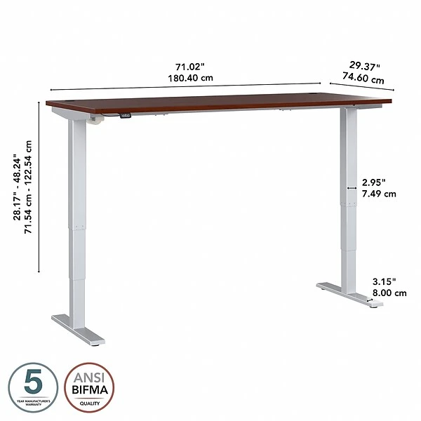 Bush Business Furniture Move 40 height-adjustable standing desk is a perfect way to build an ergonomic workspace without the high-end price tag. Give your body and mind a break from sedentary work and enjoy a healthier, more productive office with the push of a button. Three-stage units lift the 71.02″ x 29.37″ desktop anywhere from 28.17″ to 48.24″ at a speed of 1.25″ per second so you can change positions without missing a beat. The adjustable desk also features an anti-collision sensor that stops movement up or down if an object is detected. Available in your choice of five finishes, the durable thermally fused laminate work surface resists scratches and stains while a welded 16-gauge steel base allows the desktop to support up to 176 lbs. This sit-stand desk is tested to meet ANSI/BIFMA standards for safety and performance and is backed by a 5-year manufacturer’s warranty.