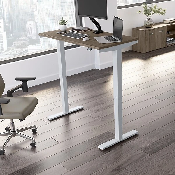 The Bush Business Furniture Move 40 electric height-adjustable standing desk is a perfect way to build an ergonomic workspace without the high-end price tag. Give your body and mind a break from sedentary work, and enjoy a healthier, more productive office with the push of a button. Three-stage units lift the desktop anywhere from 28″ to 48″ at a speed of 1.25″ per second, so you can change positions without missing a beat. The adjustable desk also features an anti-collision sensor that stops movement up or down if an object is detected. Available in several finishes, the durable thermally fused laminate work surface resists scratches and stains, while a welded 16-gauge steel base allows the desktop to support up to 176 lbs. This sit-stand desk is tested to meet ANSI/BIFMA quality standards for safety and performance and is backed by a 5-year manufacturer warranty.