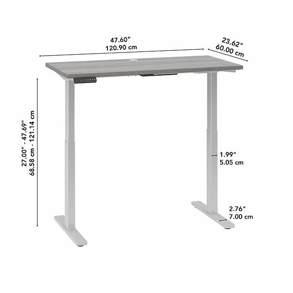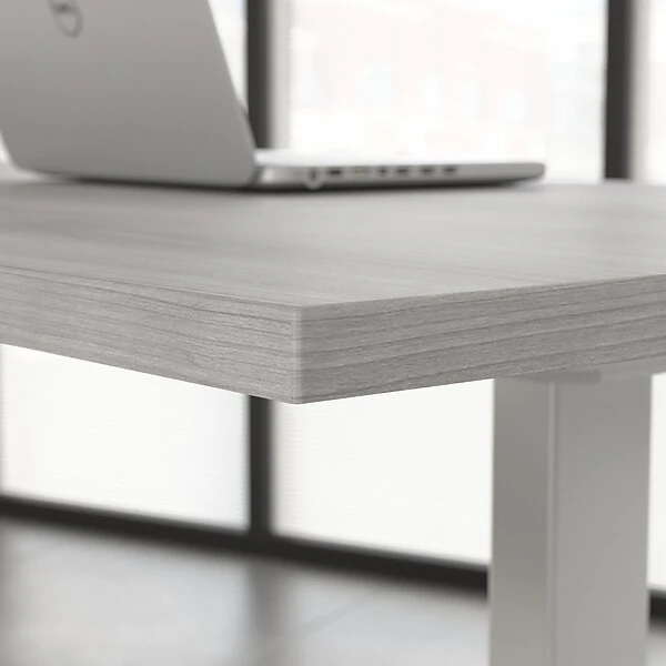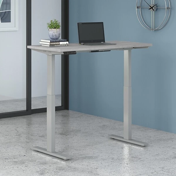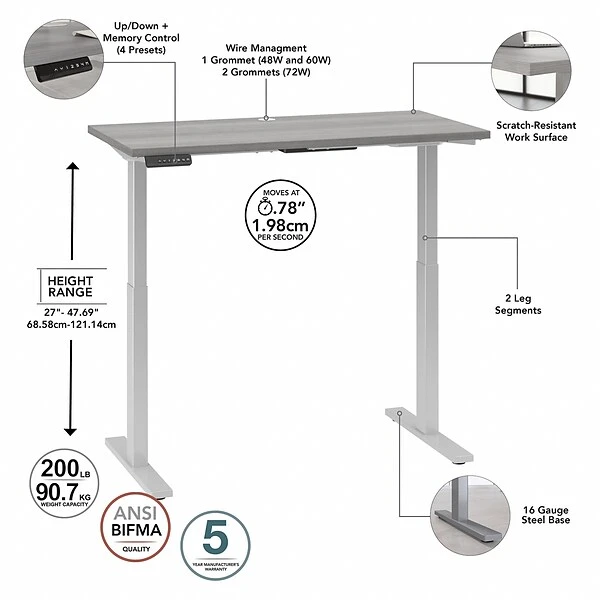 Have a healthy and productive day at the office with the Bush Business Furniture Move 60 electric height-adjustable standing desk. Those who use sit-to-stand desks report improved attitudes, energy, and comfort while getting more done, and the Bush Business Furniture Move 60 provides an affordable solution. The electric adjustable desk smoothly lifts from a low of 27″ to a high of 47.69″ at the push of a button. Store your favorite heights with four programmable presets, so you can use them as often as you like. The ergonomic desk withstands years of everyday use. A durable thermally fused laminate finish resists scratches and stains, while the sturdy steel base creates a weight capacity of up to 200 lbs. This sit-to-stand desk will have no problem holding all of your work materials. Backed by a 5-year warranty, the adjustable standing desk meets ANSI/BIFMA test standards.