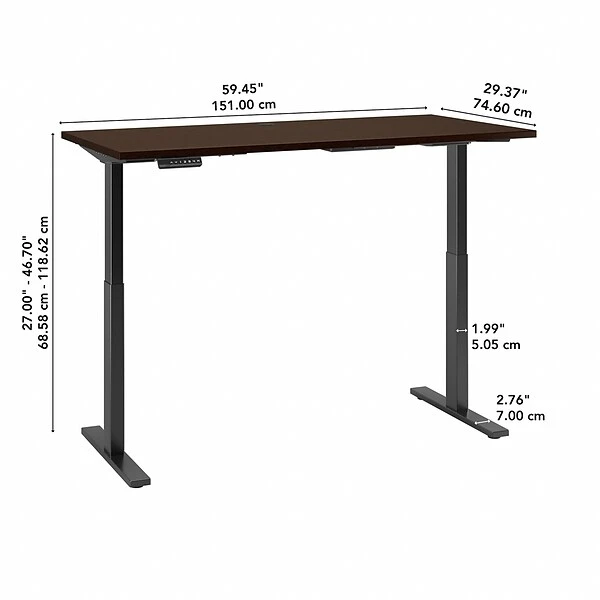 Have a healthy and productive day at the office with the Move 60 by Bush Business Furniture 60W x 30D Height Adjustable Standing Desk. Those who use sit to stand desks report improved attitudes, energy and comfort while getting more done, and the Move 60 provides an affordable solution. The electric adjustable height Desk smoothly lifts from a low of 27 inches to a high of 46.7 at the push of a button. Store your favorite heights with four programmable presets. The ergonomic Desk withstands years of everyday use. A durable thermally fused laminate finish resists scratches and stains, while the sturdy steel base creates a weight capacity of up to 200 pounds. This sit to stand Desk will have no problem holding all of your work materials. Backed by a 5 Year Warranty, the Height Adjustable Standing Desk meets ANSI/BIFMA quality test standards.