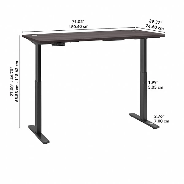 Have a healthy and productive day at the office with the Move 60 by Bush Business Furniture 72W x 30D Height Adjustable Standing Desk. Those who use sit to stand desks report improved attitudes, energy and comfort while getting more done, and the Move 60 provides an affordable solution. The electric adjustable height Desk smoothly lifts from a low of 27 inches to a high of 46.7 at the push of a button. Store your favorite heights with four programmable presets. The ergonomic Desk withstands years of everyday use. A durable thermally fused laminate finish resists scratches and stains, while the sturdy steel base creates a weight capacity of up to 200 pounds. This sit to stand Desk will have no problem holding all of your work materials. Backed by a 5 Year Warranty, the Height Adjustable Standing Desk meets ANSI/BIFMA quality test standards.