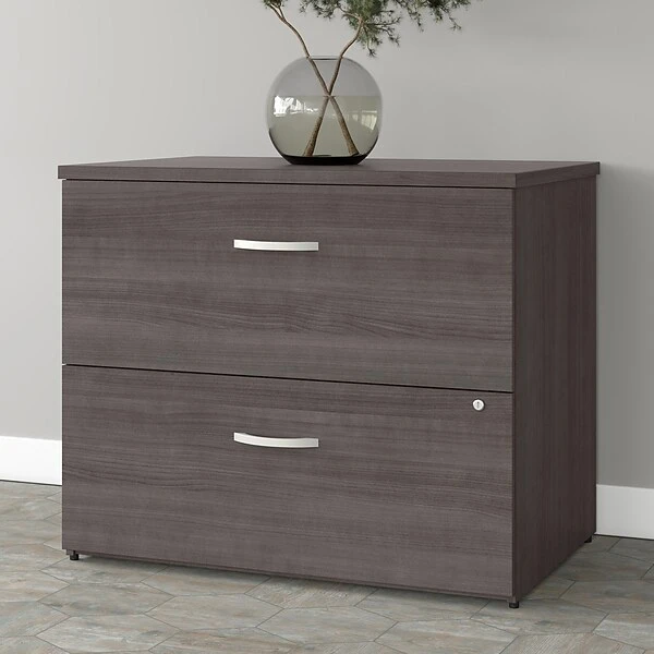 The Bush Business Furniture Studio A two-drawer lateral file cabinet combines a fresh contemporary appearance with the commercial-quality construction needed to withstand years of everyday use. Keep all your letter-, legal-, and A4-size documents organized inside two drawers that open on full-extension ball bearing slides for an effortless reach to contents. A single lock secures both drawers to protect sensitive information and safeguard any personal items you don’t want left out in the open. Each drawer can hold up to 88 lbs. of materials. The lateral file cabinet’s stable design and wall attachment hardware make it safe for use in virtually any home or professional office. This two-drawer file cabinet has been meticulously tested to meet or exceed the ANSI/BIFMA standards for safety, durability, and performance and is backed by a 10-year manufacturer limited warranty. American-made with US and imported parts.