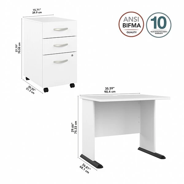 The Bush Business Furniture Studio A 36″W computer desk with three-drawer mobile file cabinet combines a fresh contemporary appearance with the commercial-quality construction needed to withstand years of everyday use. Set up with a computer and equipment on the durable thermally fused laminate desktop that supports up to 200 lbs. A built-in wire management grommet keeps cords and cables in order, so the surface remains free from unnecessary clutter. The file cabinet’s bottom drawer accepts letter-, legal-, and A4-size paperwork, while two box drawers organize supplies. The two bottom drawers can be locked to protect sensitive files and personal items. This small desk with drawers has been meticulously tested to meet or exceed the ANSI/BIFMA standards for safety, durability, and performance and is backed by a 10-year manufacturer limited warranty. American-made with US and imported parts.
