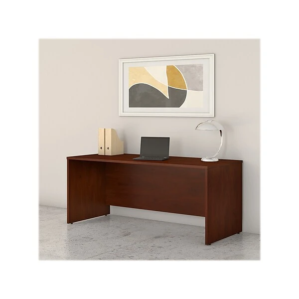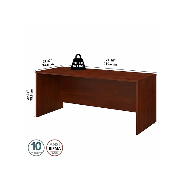Choose the Bush Business Furniture Studio C 71″ office desk for a durable design that works hard for years with a fresh finish that looks great anywhere. A thick surface, extended modesty panel, and clean lines convey a classic look that’s available in several contemporary or traditional finishes to fit any workspace. The thermally fused laminate finish, durable edge banding, and sturdy end panels resist scratches, stains, and dents while standing up to the rigors of a busy workweek. Keep pesky computer cords out of your way with an integrated cable management system for an organized work surface. This computer desk is backed by a 10-year manufacturer limited warranty and meets ANSI/BIFMA quality test standards for safety and performance. See the full collection for coordinating items available to make your office your own with Bush Business Furniture Studio C.