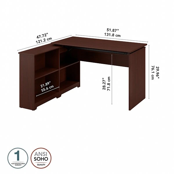 Save space, get organized and work comfortably in your home office with the Bush Furniture Cabot Sit to Stand Corner Bookshelf Desk. Smoothly lift and lock the ergonomic desktop to standing heights of 36, 39 or 42 inches from the floor, or easily return the desk to the seated position. The desktop holds up to 20 pounds when at standing height so you can bring materials with you when you need to stretch your legs. Spacious bookcase shelves adjust to fit items of varying sizes to keep everything you need within reach. The convenient Corner Desk design gives you the workspace and storage you need without taking up too much room. The Sit to Stand Corner Bookshelf Desk is backed by a Bush Furniture 1 Year Manufacturer’s Warranty.