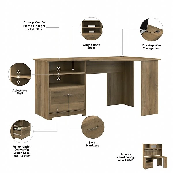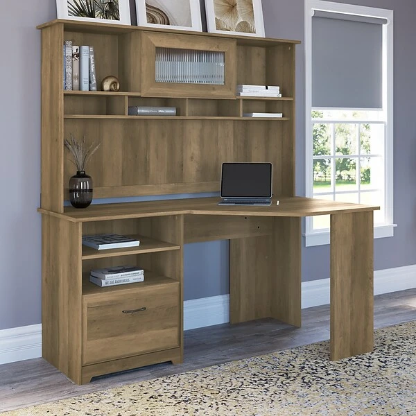Featuring ample storage and technology integration, the Bush Furniture Cabot 60″W corner desk with hutch is a smart fit for modern and traditional home offices. The stylish and functional Bush Furniture Cabot corner desk with hutch offers everything you need for a simple space-saving home office solution. The 60″W corner computer desk with hutch combination is perfect for small spaces yet provides ample room to work comfortably and stay organized. Storage can be placed on the right or left side for user preference and comfort. A full-extension file drawer glides on smooth ball bearing slides for an effortless reach to letter- and legal-size documents, and an open cubby shelf is perfect for keeping books and office supplies in order. The hutch boasts an elegant fluted glass door, two open compartments, and four work-in-progress areas to help keep your desk surface clutter free. This home office desk with storage set is tested to meet ANSI/BIFMA standards for safety and performance and is backed by a 1-year manufacturer limited warranty.