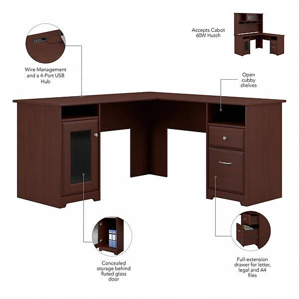 The Bush Furniture Cabot L Shaped Computer Desk with Hutch offers a spacious and efficient workplace for your home office. Enjoy a traditional look with smart features for your convenience. The L Shaped Desk design provides a large work surface and just the right amount of storage to keep you feeling neat and organized. Storage details include an enclosed cabinet with a fluted glass door and a box drawer for supplies. A file drawer opens on smooth ball bearing slides for an easy reach to letter, legal or A4-sized files. A built-in 4-port USB hub adds convenience as you’ll keep all of your devices connected. The Hutch boasts a matching fluted glass door, two large open compartments and four work-in-progress areas to help keep your desktop clutter free. This home office desk with storage is tested to meet ANSI/BIFMA standards for safety and performance and is backed by a 1 Year Warranty.