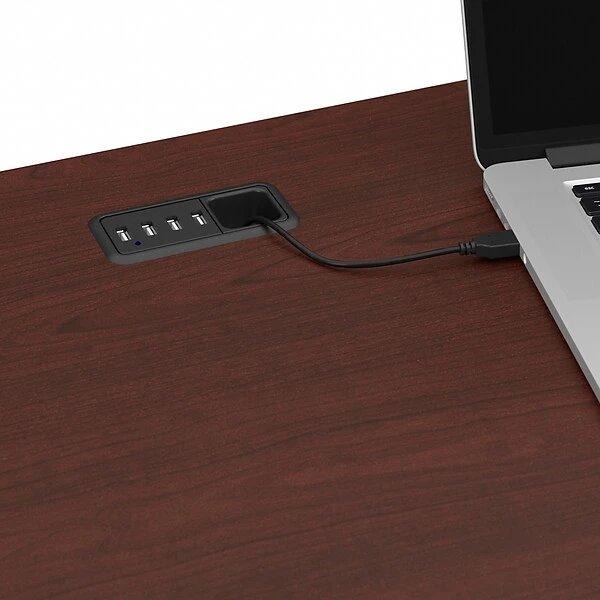 - Corner desk surface includes built-in wire management and 4-port USB hub for connecting electronic devices