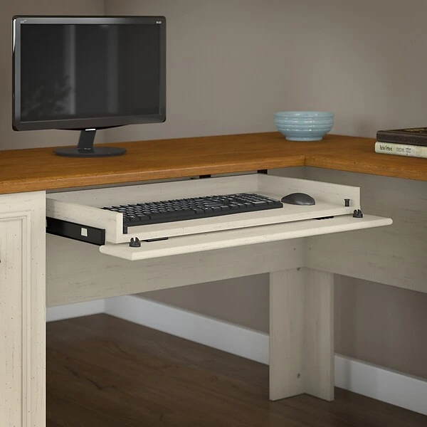 Bring a slice of modern farmhouse styling into your home office with the Bush Furniture Fairview L Shaped Desk. Spread out, surf the net and pay bills on the durable surface, and stash supplies in the box drawer or open storage space. Organize mail in the letter-size file drawer or vertical closed storage area, and store your laptop or keyboard in a drawer with a drop-down front. Antique Pewter hardware adds character to your home office. Attach the Hutch (sold separately) to either side of the L Shaped Desk to fit your needs. Available in attractive Antique Black with Hansen Cherry accents or Antique White with Tea Maple accents, Fairview meets ANSI/SOHO quality test standards for performance and safety, and comes with a 6 Year Manufacturer’s Warranty. See the full collection for coordinating items available, including the Hutch.