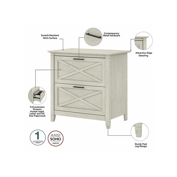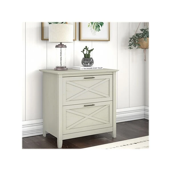 A natural fit for homes that embrace coastal and farmhouse decor, the Bush Furniture Key West two-drawer lateral file cabinet is perfect for organizing paperwork in virtually any room. Two file drawers open on smooth full-extension ball bearing slides for an easy reach to legal- and letter-size documents. Stylish X-shaped accents on the drawer panels create a relaxed style supported by a sturdy and attractive post leg design. This lateral file cabinet matches the height of any Bush Furniture Key West desk (sold separately) to create an extended work surface when placed side by side. The Bush Furniture Key West collection offers a wide variety of farmhouse furniture that makes building a complete home office or living room a breeze. This two-drawer file cabinet is tested to meet ANSI/SOHO quality standards for safety and performance and is backed by the Bush Furniture 1-year manufacturer limited warranty.