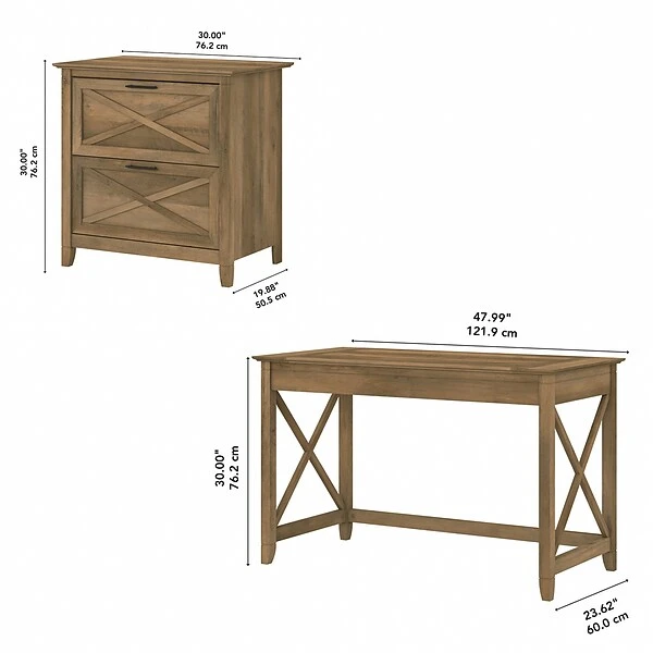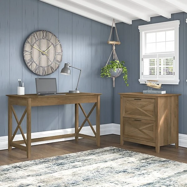 The Bush Furniture Key West 48″W writing desk with a two-drawer lateral file cabinet provides a practical home office furniture set with casual farmhouse style. A natural fit for homes that embrace coastal and farmhouse decor, the Bush Furniture Key West writing desk with a lateral file cabinet creates a comfortable and spacious feeling, even in compact areas. This small computer desk provides plenty of room to spread out with a laptop and paperwork while boasting a weight capacity of 200 lbs. The lateral file cabinet matches the writing desk’s height for an extended work surface when placed side by side. Two file drawers open on smooth full-extension ball-bearing slides for easy access to your legal- and letter-size documents. Stylish X-shaped accents and sturdy, attractive post leg design help give this furniture set a relaxed and airy feel. This small desk with file cabinet is tested to meet ANSI/SOHO quality standards for safety and performance and is backed by the 1-year manufacturer warranty.