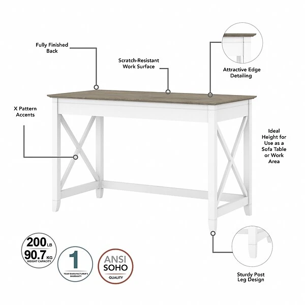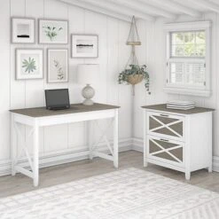 The Bush Furniture Key West 48″W writing desk with a two-drawer lateral file cabinet provides a practical home office furniture set in casual farmhouse style. A natural fit for homes that embrace coastal and farmhouse decor, the Bush Furniture Key West writing desk with a lateral file cabinet creates a comfortable and spacious feeling, even in compact areas. This small computer desk provides plenty of room to spread out with a laptop and paperwork while boasting a weight capacity of 200 lbs. The lateral file cabinet matches the writing desk’s height for an extended work surface when placed side by side. Two file drawers open on smooth full-extension ball bearing slides for easy access to your legal- and letter-size documents. Unique X-pattern accents and sturdy, attractive post leg design give this furniture set a relaxed and airy feel. This set is tested to meet ANSI/SOHO quality standards for safety and performance and is backed by a 1-year manufacturer warranty.