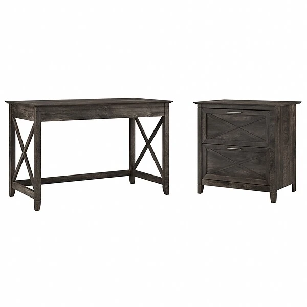 The Bush Furniture Key West 48″W writing desk with two-drawer lateral file cabinet provides a practical home office furniture set with casual farmhouse style. A natural fit for homes that embrace coastal and farmhouse decor, the Bush Furniture Key West 48″W writing desk with two-drawer lateral file cabinet creates a comfortable and spacious feeling, even in compact areas. This small 48″W x 24″D computer desk provides plenty of room to spread out with a laptop and paperwork while boasting a weight capacity of 200 lbs. The lateral file cabinet matches the writing desk’s height for an extended work surface when placed side by side. Two file drawers open on smooth full-extension ball bearing slides for easy access to your legal- and letter-size documents. Stylish X-pattern accents and sturdy, attractive post leg design give this furniture set a relaxed and airy feel. This small desk with drawers is tested to meet ANSI/SOHO quality standards for safety and performance and is backed by the 1-year manufacturer warranty.