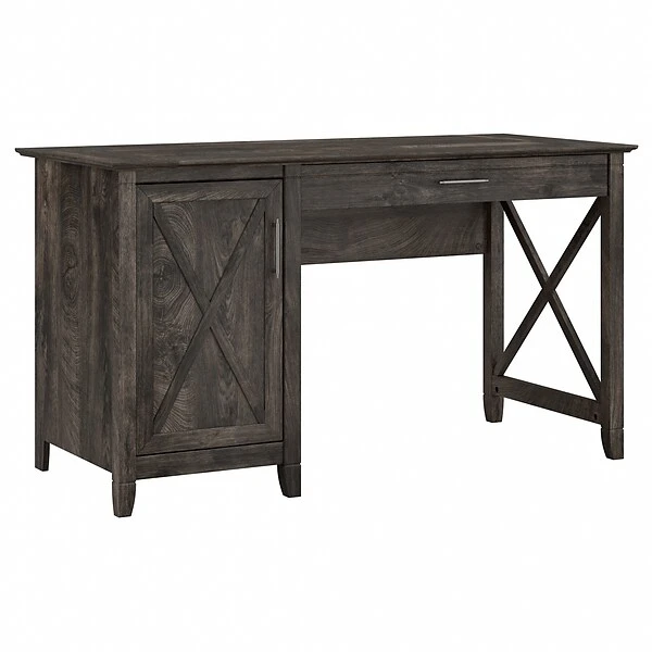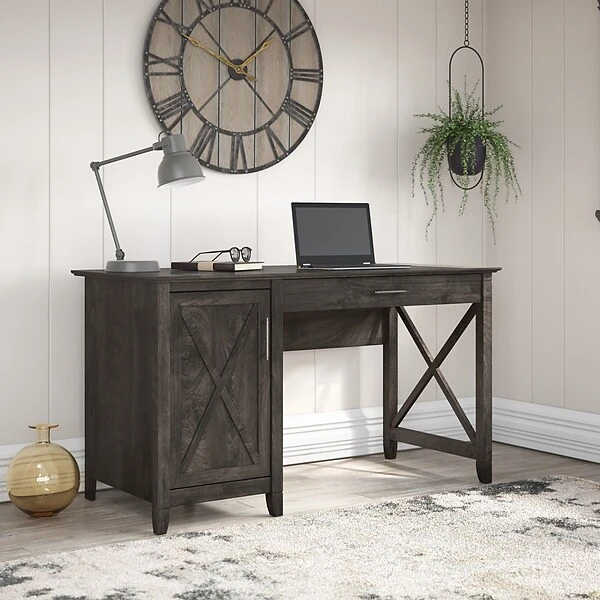 The Bush Furniture Key West 54″W computer desk with keyboard tray and storage features an easygoing style that’s perfect for your casual home office. Designing your ideal home office is a breeze thanks to the Bush Furniture Key West computer desk with keyboard tray and storage. The 54″W x 24″D work surface offers plenty of room to spread out with a computer and paperwork as you surf the web, pay bills, or check the mail. A pullout keyboard tray features a flip-down front that folds up neatly when not in use. The drawer also provides a convenient place to keep your laptop or tablet and opens on smooth full-extension ball bearing slides. A built-in storage cabinet includes one adjustable shelf to accommodate reference materials and office supplies of various sizes. The sturdy and attractive post leg design allows the computer desk to support up to 200 lbs., so you can keep books and other equipment close by while you work. This home office desk is tested to meet ANSI/SOHO quality standards for safety and performance and is backed by a 1-year warranty.