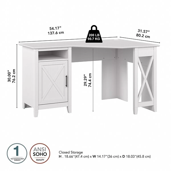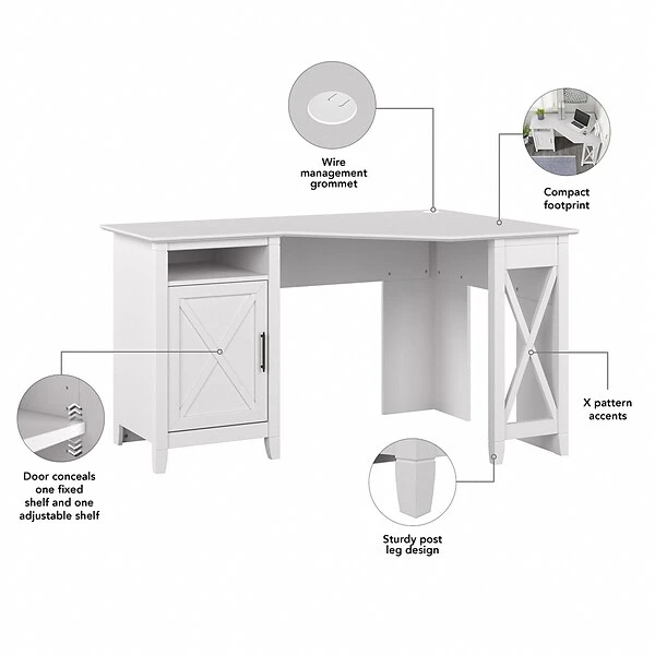 The Bush Furniture Key West 54″W corner computer desk with storage offers a practical workspace solution that brings a touch of casual style to your home office. Spread out with a computer, books, paperwork, and more on a durable desktop that supports up to 200 lbs. The corner desk’s work surface also includes a built-in wire management grommet to keep cords and cables out of the way. Keep important materials organized and accessible inside a vertical storage cabinet with one fixed shelf and one adjustable shelf. An open cubby space allows for easy access to work in progress, small office supplies, and other frequently used items. X-shaped accents convey a casual appearance that works well with cottage, coastal, and modern farmhouse style. This home office desk with storage has been tested to meet ANSI/SOHO standards for safety and performance and is backed by 1-year warranty.