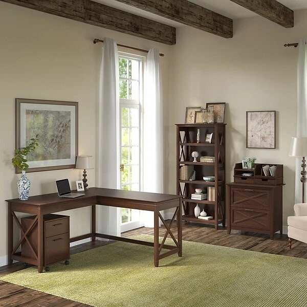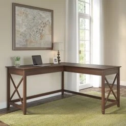 The Bush Furniture Key West 60″W L-shaped desk features an easy-going style that makes it a perfect choice for your casual home office or living space. Save floor space in compact areas by placing the desk in a corner or make use of the fully finished back to take a prominent position in the middle of the room. The 60″W x 60″D durable work surface is spacious enough to spread out with a computer, paperwork, and more when taking on your task of the day or just browsing the web. A sturdy post leg design with unique X pattern accents on the side panels create a relaxed, open appearance while thoughtful construction and quality materials allow the corner desk to support up to 200 lbs.. This L-shaped computer desk is tested to meet ANSI/SOHO quality standards for safety and performance and is backed by a 1-year manufacturer warranty. See the full collection for coordinating items available.