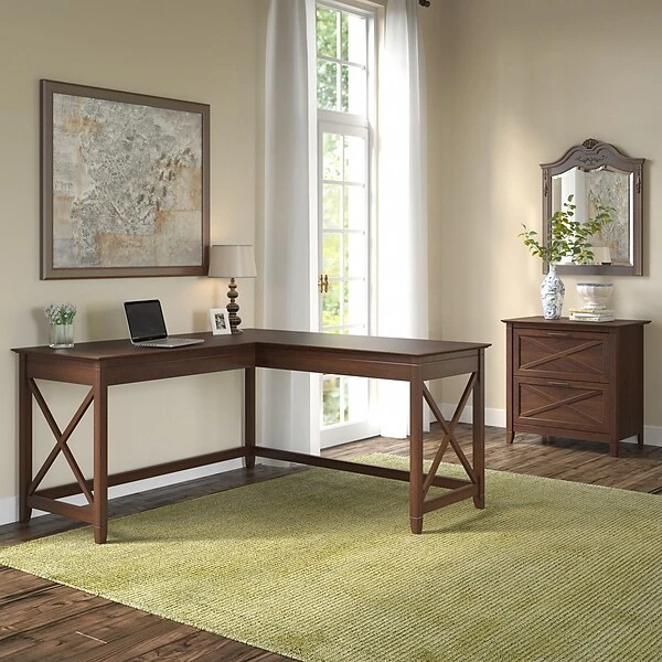 The Bush Furniture Key West 60″W L-shaped desk and two-drawer lateral file cabinet provide a practical home office furniture set with a casual farmhouse style. This set turns any room into a practical home office with an easy-going style. The 60″W x 60″D durable work surface is spacious enough to spread out with a computer, paperwork, and more when taking on your task of the day or just browsing the web. A sturdy post leg design and thoughtful construction with quality materials give the L-shaped computer desk a weight capacity of 200 lbs.. The two-drawer filing cabinet opens on smooth full-extension ball bearing slides for an easy reach to legal- and letter-size documents. Unique X pattern accents on side panels of the L-desk and the cabinet’s file drawers create a relaxed appearance that blends seamlessly with coastal and farmhouse decor. This furniture set is tested to meet ANSI/SOHO quality standards for safety and performance and is backed by a 1-year warranty.