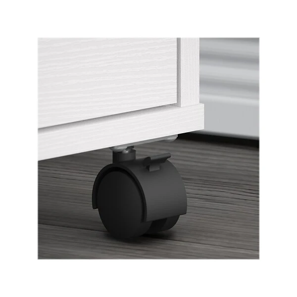 - File cabinet can roll underneath the L-shaped desk and features front-locking casters for secure placement