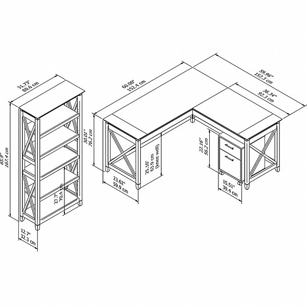 - Bundle includes: 60″W L-shaped desk, two-drawer mobile file cabinet, five-shelf bookcase