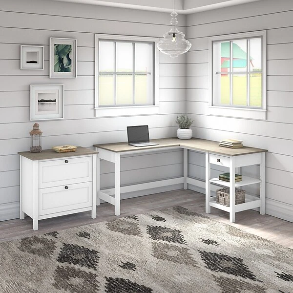 The Bush Furniture Mayfield 60″W L-shaped computer desk with two-drawer lateral file cabinet gives your home office a touch of modern farmhouse style. Stay on top of your daily tasks with a workspace that suits your casual home. Highlighted by its relaxed modern farmhouse style, the Bush Furniture Mayfield 60″W L-shaped computer desk with two-drawer lateral file cabinet also includes plenty of features to keep you feeling productive. Spread out on a durable 60″W x 60″D corner desk surface that supports a computer, books and more with a weight capacity of 200 pounds. Two shelves and a box drawer ensure that papers and supplies are always within reach. Store your legal, letter and A4-size documents in the lateral filing cabinet, which matches the L-shaped desk’s height for an extended work area when placed side by side. File drawers open on smooth full-extension ball bearing slides for an easy reach to contents. This farmhouse desk with storage set is tested to meet ANSI/SOHO standards for safety and performance and is backed by a 1-year warranty.