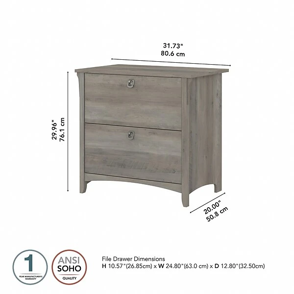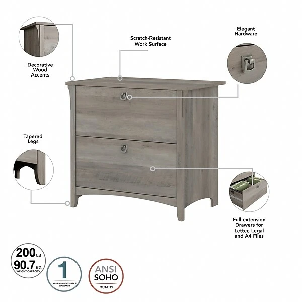 Keep your home office organized with a storage solution that’s as beautiful as it is functional. The Bush Furniture Salinas two-drawer lateral file cabinet creates a casual feel in your home office with decorative wood details, tapered legs, and curved base rails inspired by Mission styling. Two file drawers accept letter-, legal-, and A4-size documents and open on smooth full-extension ball bearing slides so you’ll have no trouble reaching papers in the back. The file cabinet’s height matches that of the Salinas 60″W L-shaped desk with storage (sold separately) for the option of creating an extended work surface when positioned side by side. The two-drawer file cabinet is tested to meet ANSI/SOHO quality standards for safety and performance and is backed by the Bush Furniture 1-year manufacturer’s warranty. Complete your space with coordinating items from the Salinas collection.