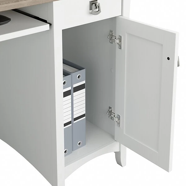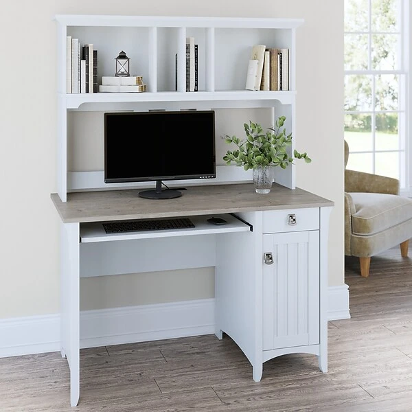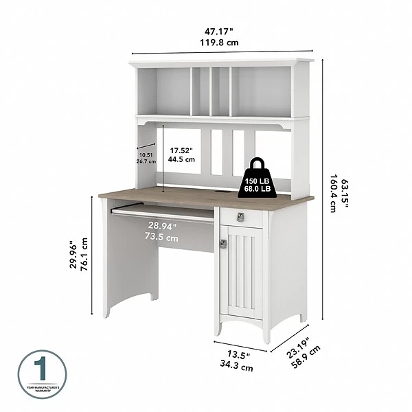 The Bush Furniture Salinas small computer desk with hutch takes timeless Mission styling and adds plenty of modern touches to help you complete your daily tasks. Technology-ready features include a pullout keyboard tray or laptop shelf and a work surface with a built-in wire management system to keep cords and cables in order. The hutch has plenty of storage space for work in progress, books, decorations, and more while the 48″W desk features a vertical cabinet with one adjustable shelf along with a box drawer to organize office supplies and writing utensils. This computer desk is perfect for small spaces. The compact design boasts a sturdy construction with clean lines, tapered legs, and attractive wood detailing. The durable desktop supports up to 150 lbs. and offers ample space to complete projects and assignments, pay bills, or surf the web. This home office desk set is backed by a 1-year warranty.