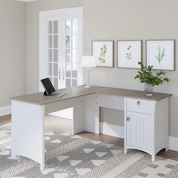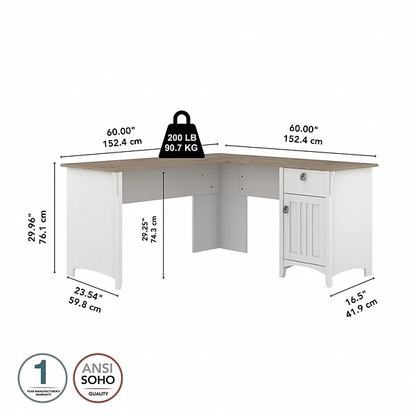 Make your home office space comfortable, functional, and beautiful with the Bush Furniture Salinas L-shaped computer desk with storage. Attractive wood details, vertical accents, curved base rails, and tapered legs inspired by mission styling create a casual look fit for any cottage, family home, or apartment. You’ll love all the room you have to multitask on the L-shaped desk designed to save space in your home with a variety of placement options, including in the corner. The desktop supports up to 200 lbs., so you can get to work with all your materials close by. Store writing utensils and small office supplies in the convenient box drawer, and keep larger items in a vertical storage cabinet that features an adjustable shelf. This corner desk with storage is tested to meet ANSI/SOHO quality standards for safety and performance and is backed by the Bush Furniture 1-year manufacturer limited warranty.