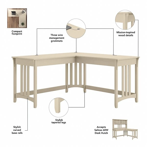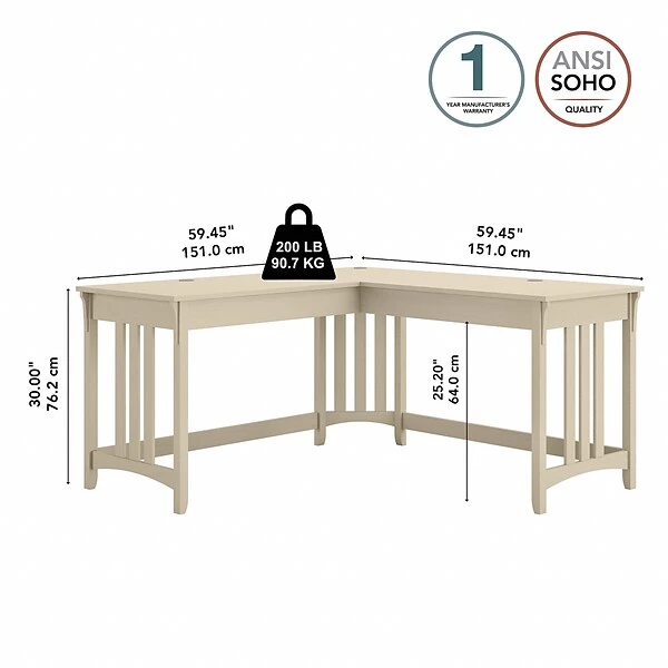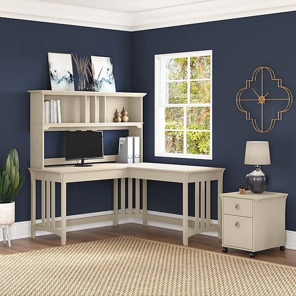 The Bush Furniture Salinas 60″ L-shaped writing desk offers a practical home office solution with casual farmhouse style. Take on your next project or assignment with a computer, books, paperwork, and more on a durable work surface that supports up to 200 lbs. The spacious desktop extends a full 60″ in each direction, so you’ll have plenty of room to spread out with all the materials you need to stay on task. The L-shaped desk design also features three built-in wire management grommets to keep pesky cords and cables out of the way while you work. Maximize the potential of a compact workspace by placing the L-desk in a corner, or make use of the finished back to take a prominent position facing out into the room.