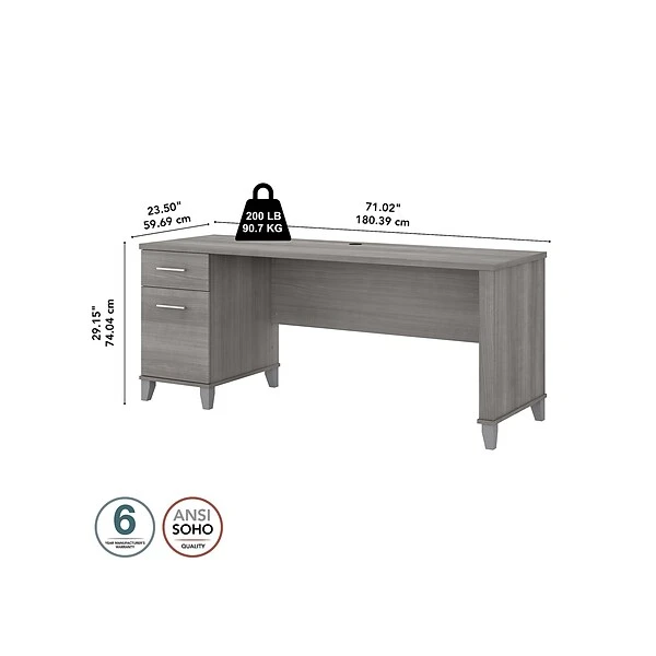 An expansive work surface and built-in storage make the Bush Furniture Somerset office desk with drawers a perfect choice for your home office. The spacious desktop offers plenty of room to spread out with a computer and paperwork and includes a wire management grommet to keep cords and cables secure and out of sight. The desk’s file drawer opens on full-extension ball bearing slides for easy access to legal- and letter-size documents, while a box drawer keeps the office supplies and utensils you need close by. A finished back side allows the desk to look great no matter where it’s positioned in the room. The office desk with drawers meets or exceeds ANSI/SOHO standards for safety and performance and is backed by a 6-year manufacturer limited warranty.